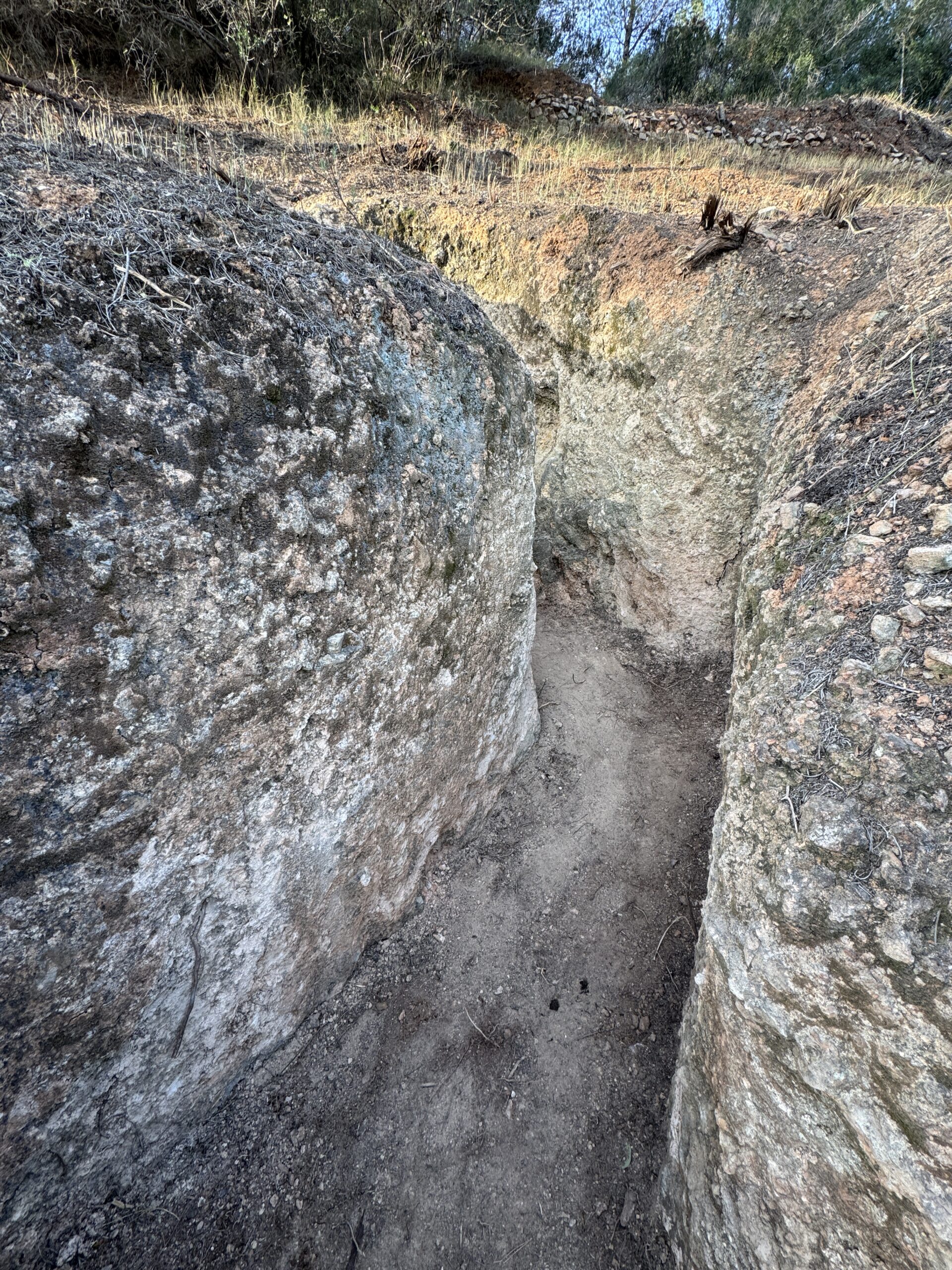 Tras un primer trabajo de poda y tala de la abundante vegetación, se localizó el tramo de trinchera, con su habitual zigzag, pero con la sorpresa de la existencia de un refugio excavado en montaña con tres bocas de entrada y salida en su recorrido, con unos pasillos interiores en un perfecto estado, gracias a que no han existido muchas visitas vandálicas que alteraran el interior. Estas trincheras no fueron finalizadas, ya que en su extremo este se encuentra excavado el foso que debía albergar un nido de ametralladora de planta cuadrangular. Sabemos que su construcción data de finales de 1938 y principios de 1939, tocando a fin la guerra civil, por lo que se dejó inacabada la estructura defensiva.